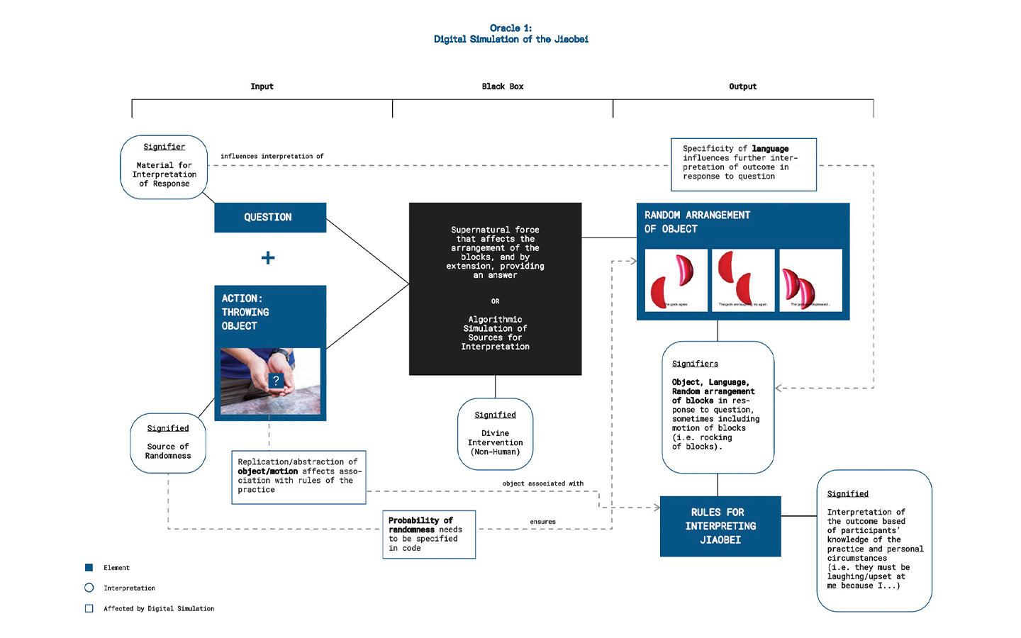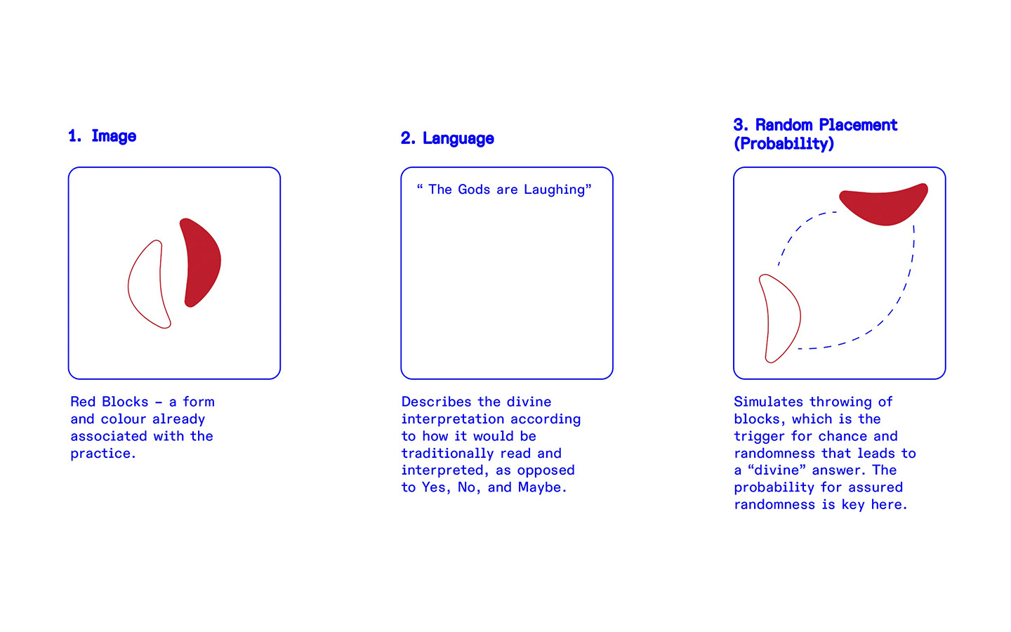 Consider why each of these help make decisions differently. If I were to present the blocks as a black and white square, it would achieve the same outcome, but it would not bear the visual signifiers present that gives the divination its significance (specific to the individual).If I push this further, I would argue that this mechanism mirrors the way a computer makes decisions through a binary system – one we understand as 1s and 0s. If the binary system is truly left to chance, or instructed so, the computer then becomes an object where divination occurs infinitely.