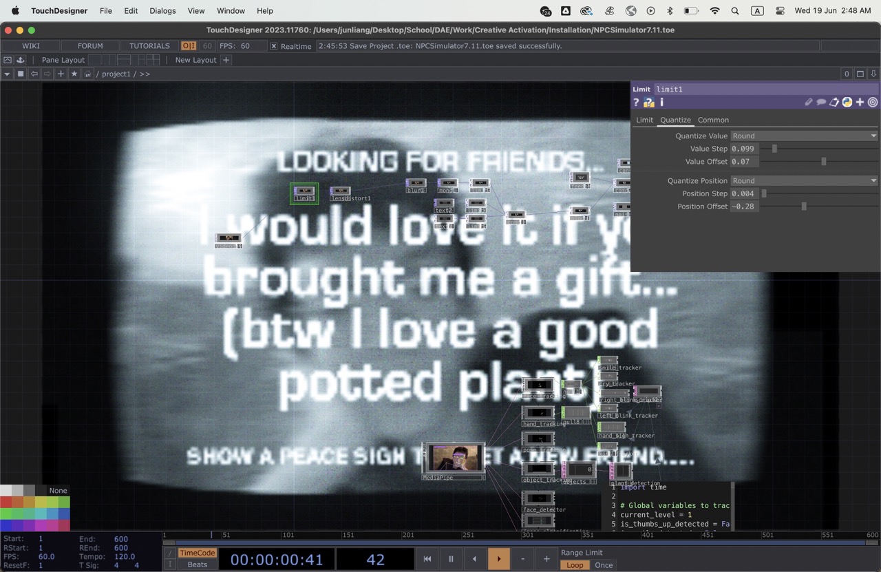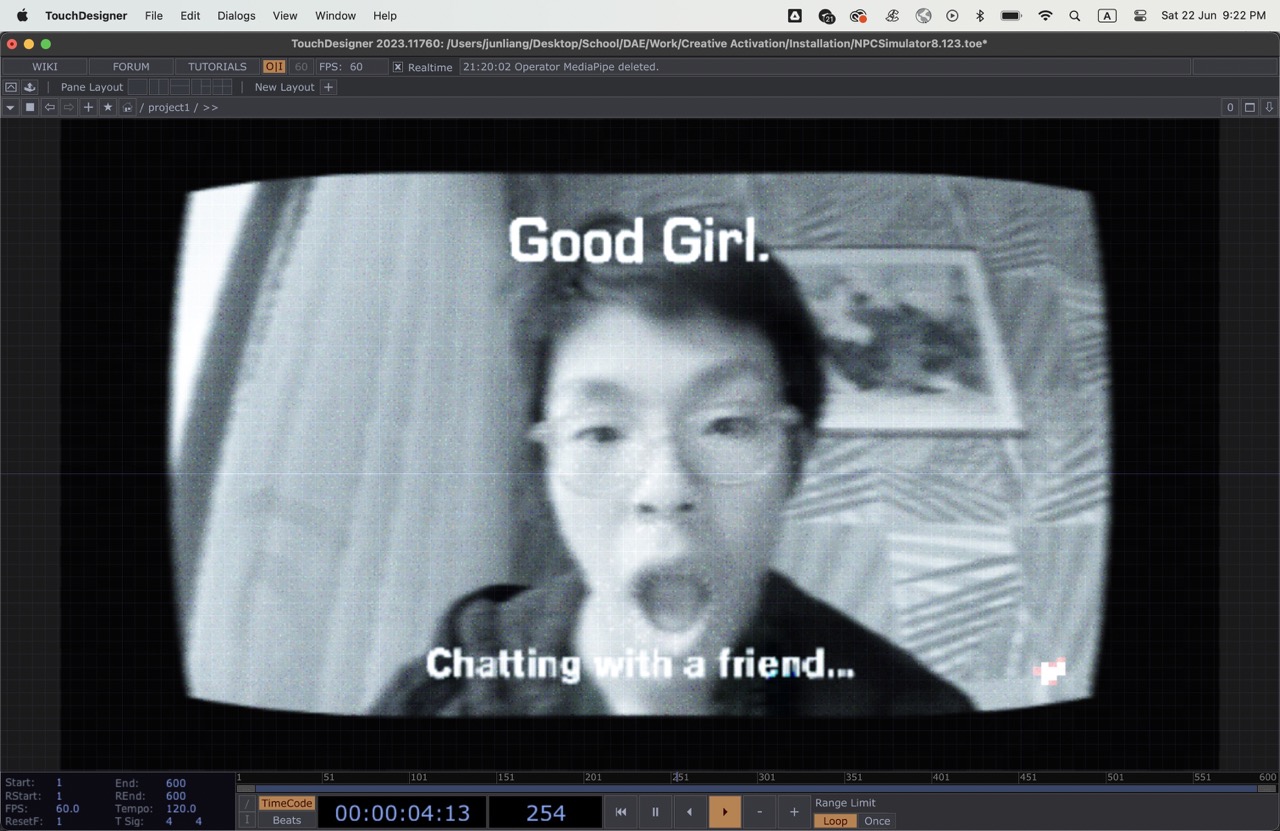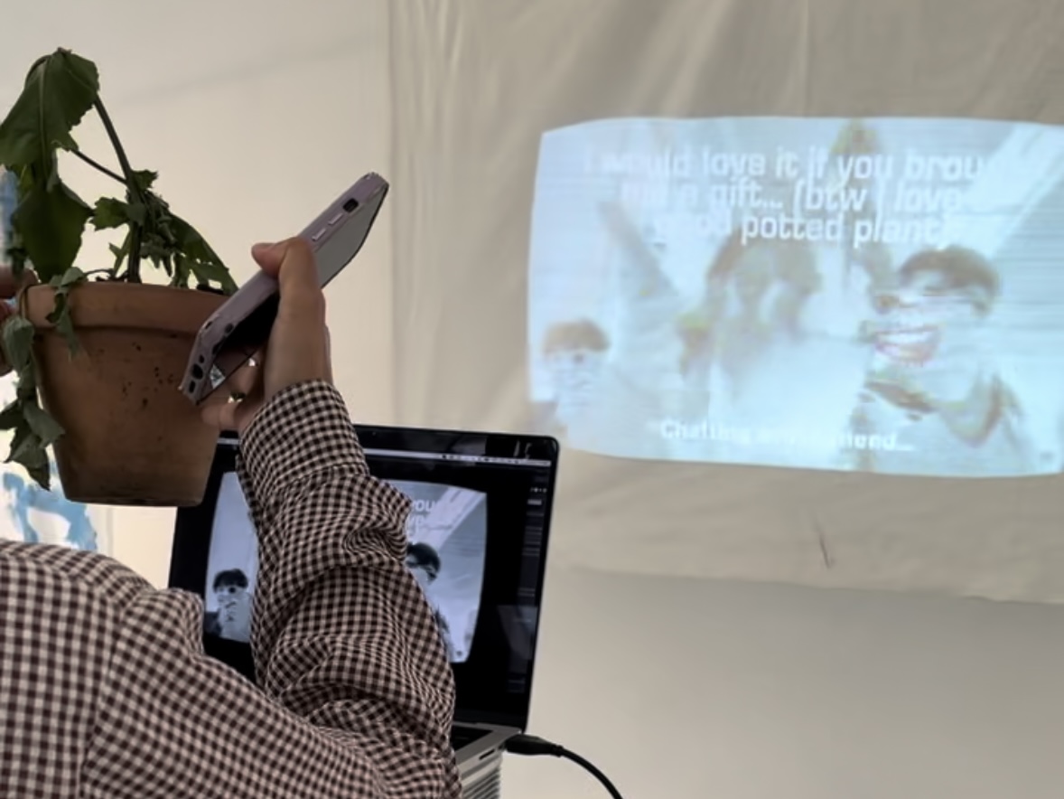 The outcome was an interactive installation in which the audience speak to an unknown entity across the screen that has them performing a series of activities ranging from a thumbs up, a wink, to bringing a potted plant to please the entity. This allowed the audience to step into the shoes of the NPC avatars on the internet, allowing them to question their own interactions with strangers on the internet through an embodied performance.