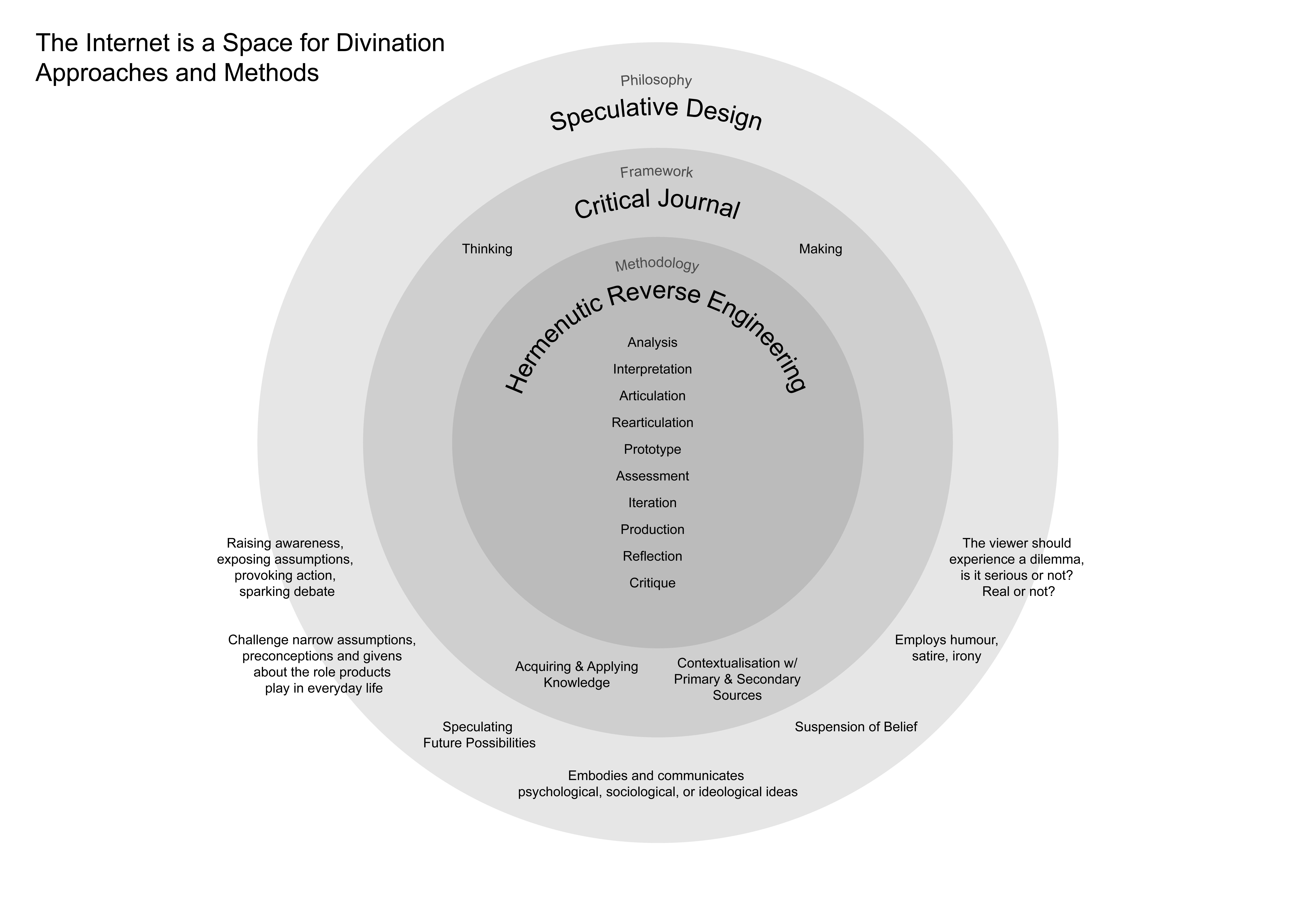 The hermeneutic reverse engineering methodology offers ways of acquiring knowledge about elements of signification in a site or object of divination, which is crucial for a practice that is largely informed by the signs and metaphors. This process of acquisition will occur through first-person observations (interactions with devices/the internet) supplemented by secondary resources (existing literature). This will provide the foundation of the making process (rearticulation), starting the self-informing process of prototyping, assessment, iteration, and reflection. This making process will be informed further by the philosophies of speculative design, in which the designing process considers how an artefact embodies and communicates psychological, sociological, or ideological ideas. (Tharp and Tharp 74). The findings from these iterative processes of making and reflection will then be documented in the critical journal, in addition to relevant contextualisation against theories and ideas from my reading list.