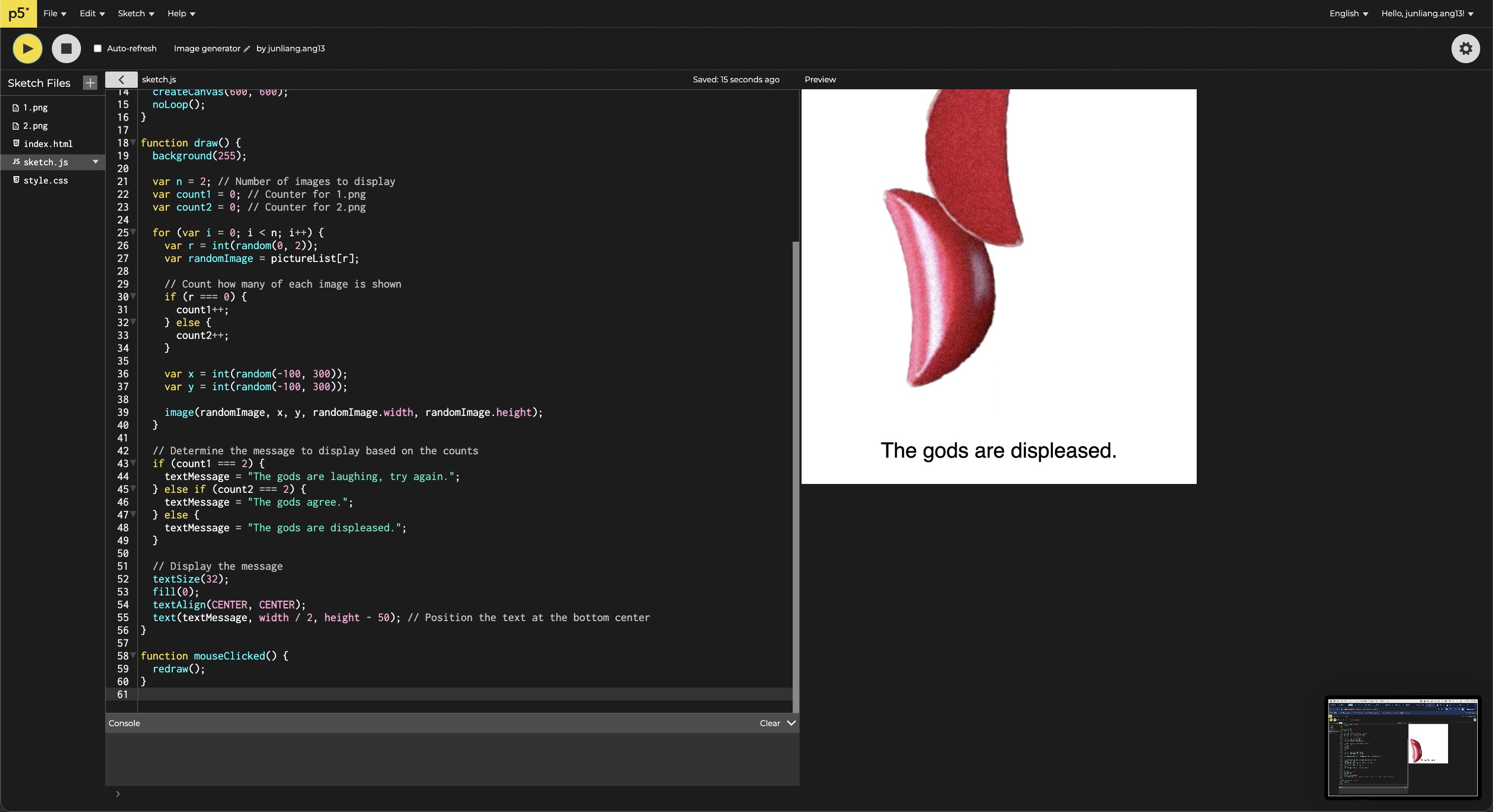 My first task was to translate this practise through code in p5js.I found an image generation template that selected images from the library at random, and displayed them in random positions across the screen. I then replaced the images with a block facing up, and another facing down.
