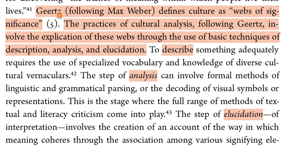 Clifford Geertz's method of cultural analysis (description, analysis, and elucidation.)