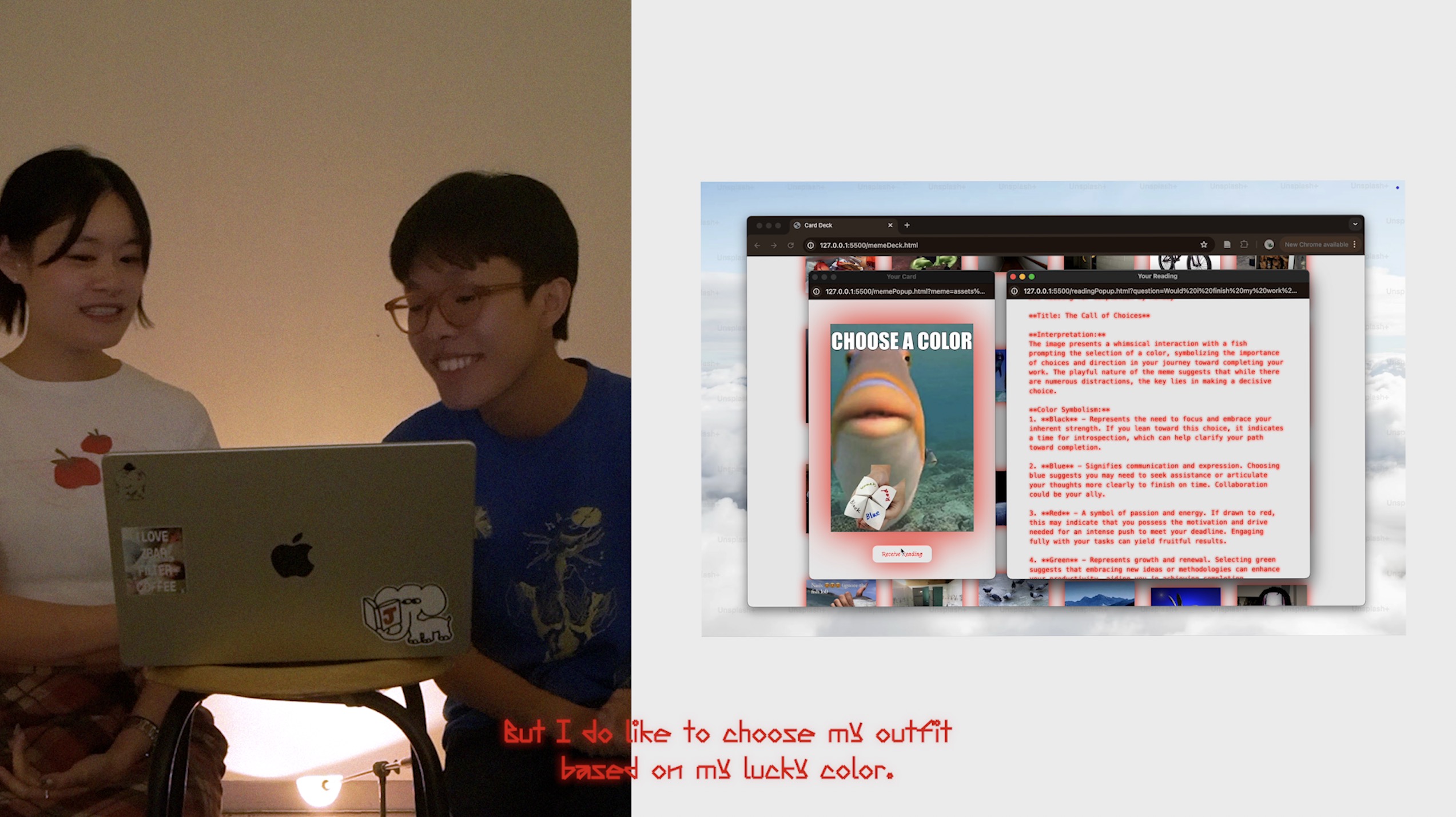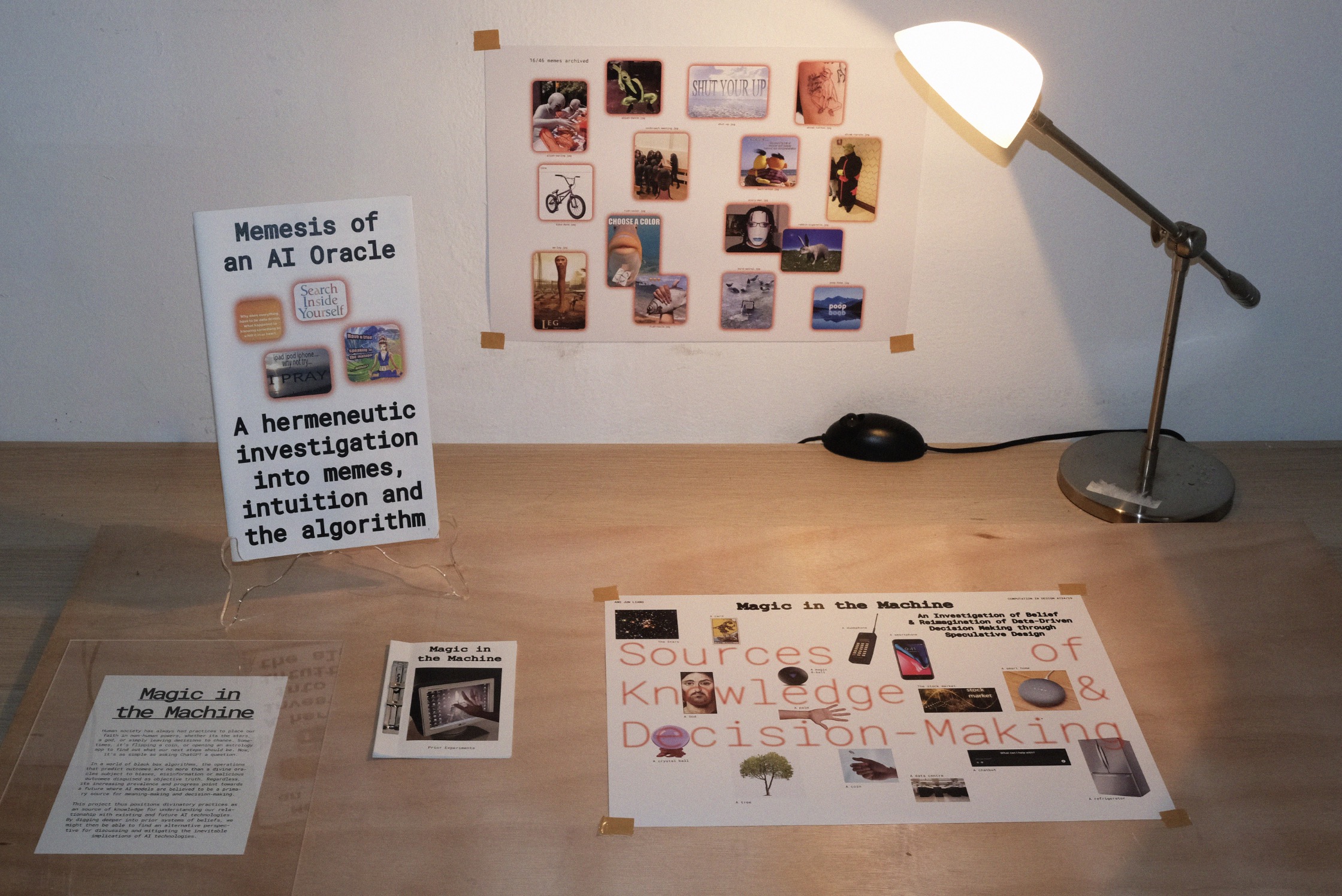 My project currently lives entirely in the digital, except for the "interview"-style reading I conducted for the meme tarot activity. I wondered if there were ways to better present my projects, with interaction, that allowed for the participant to be more engaged with the subject matter. This could be through video, interaction, etc. Another consideration for this would be for open studio/viva voce presentation. Ideally I would like the physical presentation to be more dynamic and interesting, rather than just screens and print outs. I haven't decided what that means exactly yet, but I'm keeping this in mind. I am reminded of my table setups in my exchange school. I've learnt that it is definitely way more interesting to have setups that present your work in contrasting ways, and that is something I would try to do for my project as well.