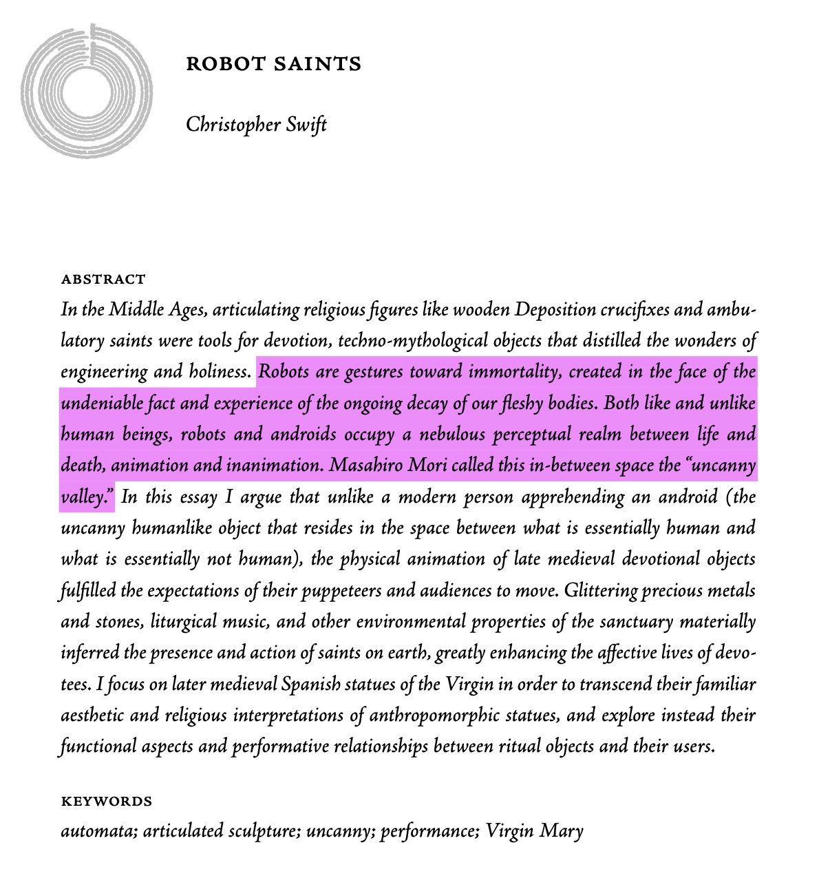 I rediscovered a reading I found earlier in the first semester called "Robot Saints." In it, the