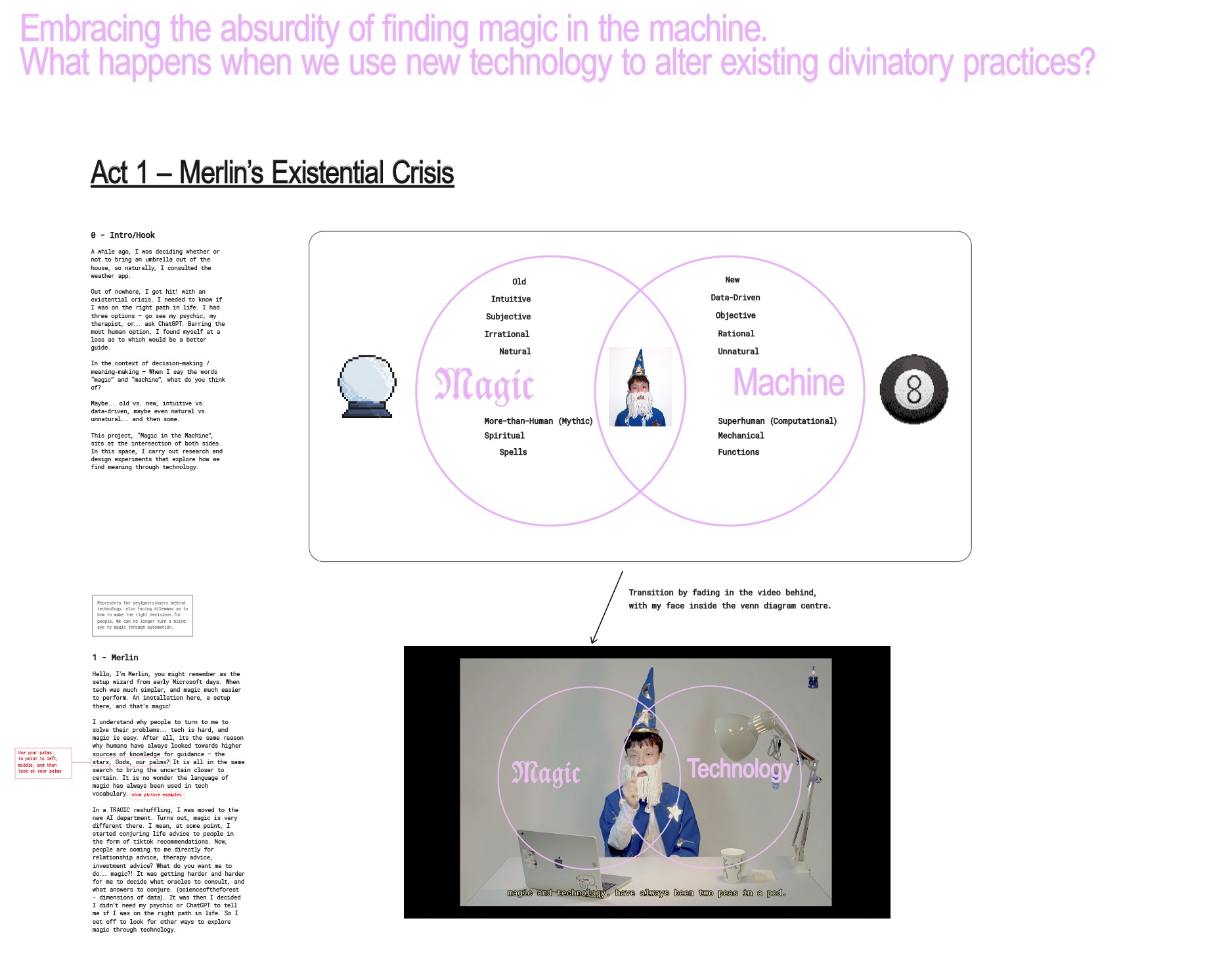 Realising that the clips I had last week were either too long-winded or vague, I re-wrote a script that takes place over 3 acts for "Merlin's Existential Crisis" – to explain the journey of the oracles through...well, Merlin's existential crisis.
