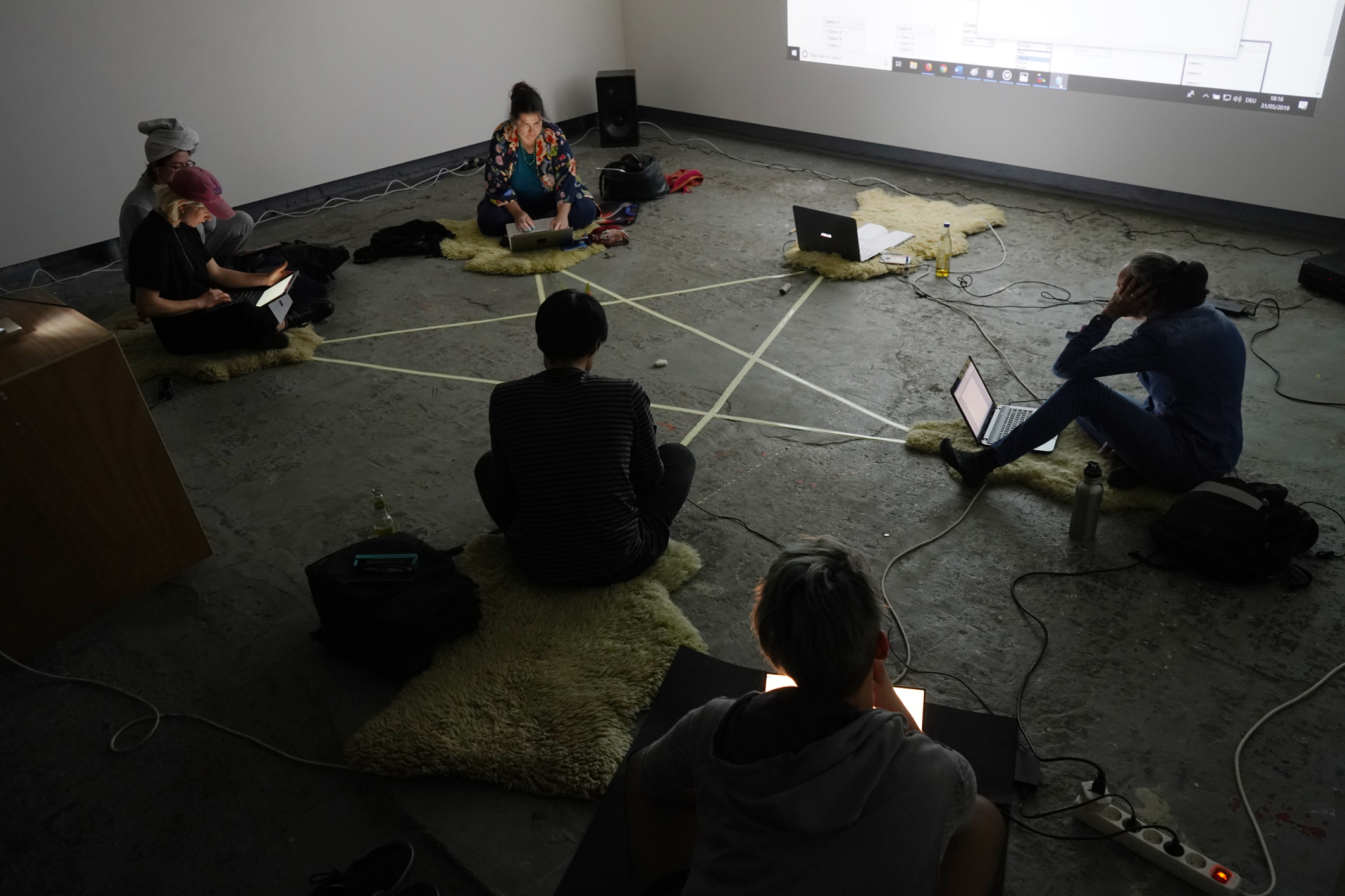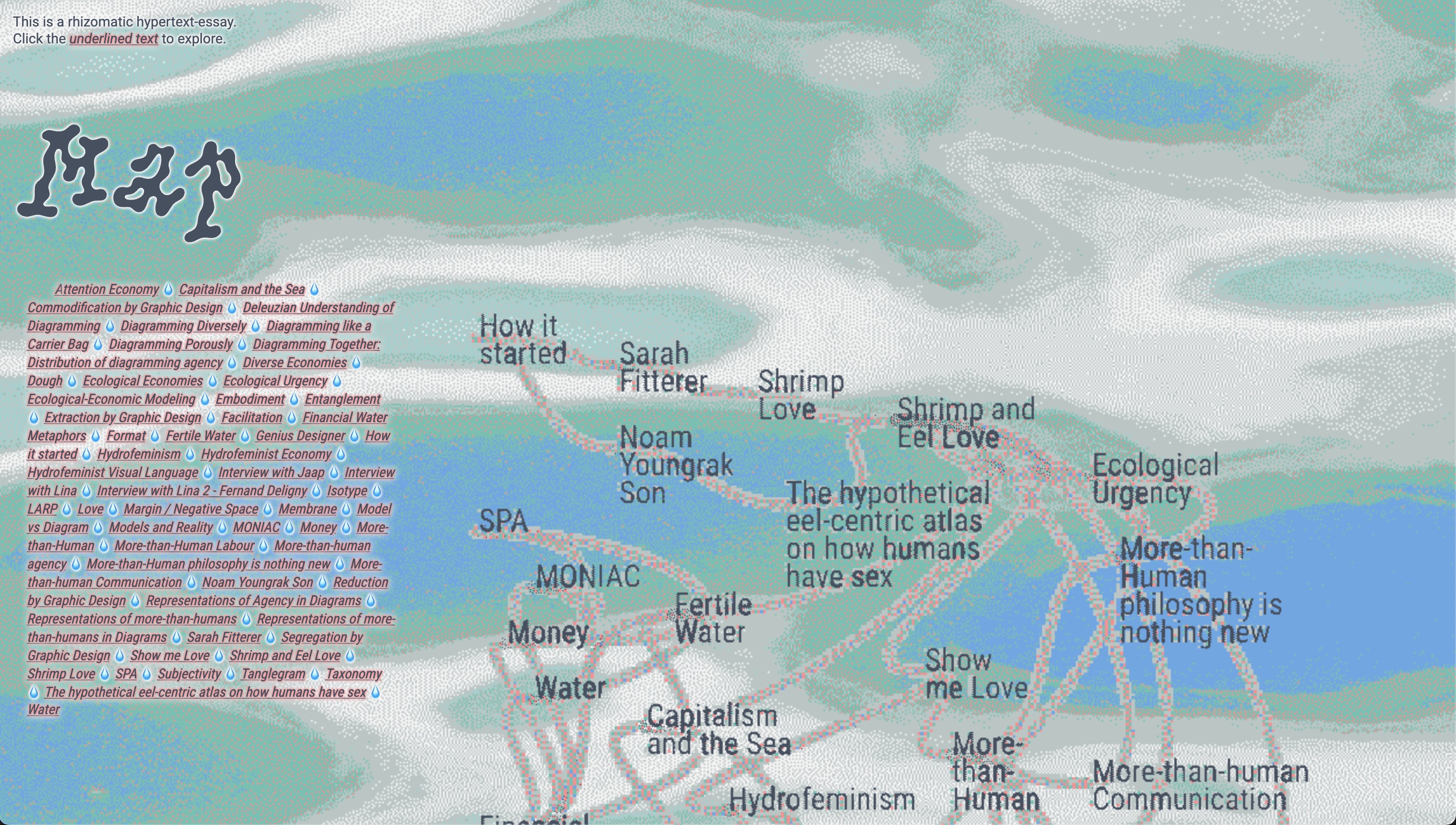 I don't know what the plan is for this yet but the ideal is an interactive installation that is either guided (by me) or independent, where the audience can interact with the content in a interactive manner. On the left are some potential (maybe very distant) vibes I could conjure.